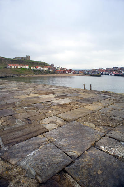 Detail of the East Pier in Whitby showing the old stone flagstones used in its construction with the town visible in the distance