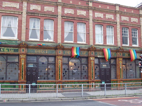 gay bay, cardiff, wales, welsh, rainbow flag, banner, tiled walls, tiles, brains beers, pedestrian barriers