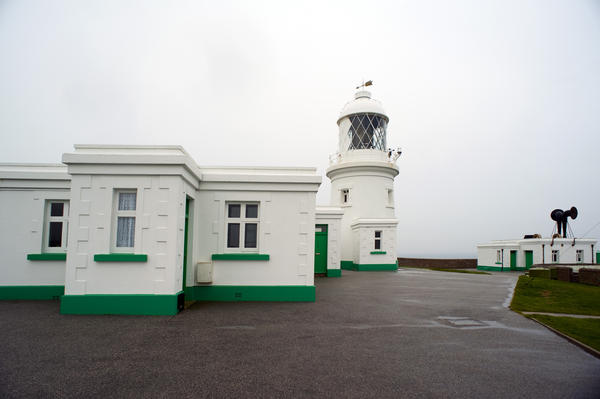 pendeen lighthouse, cornwall, square, white, painted, navigation, beacon, squat, low, cliff top, green, sounder, horn, foghorn, overcast