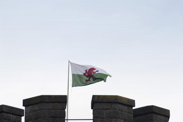 National flag of Wales, or the Baner Cymru, with it red dragon flying above the ramparts of the keep at Cardiff Castle, Wales