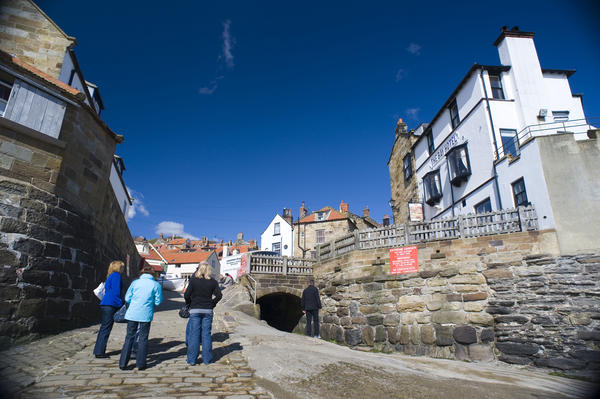 vacation, people, blue, summer, sky, old, holiday, house, cobblestones, walking, seaside, resort, historical, england, fishing, village, english, landing, cobbles, yorkshire, homes, quaint, fishing village, robin hoods bay, slipway