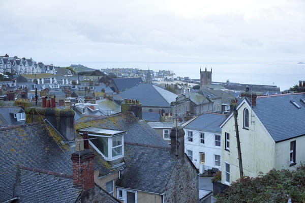 View across the rooftops of St Ives, Cornwall looking towards the harbour and ocean on a misty day
