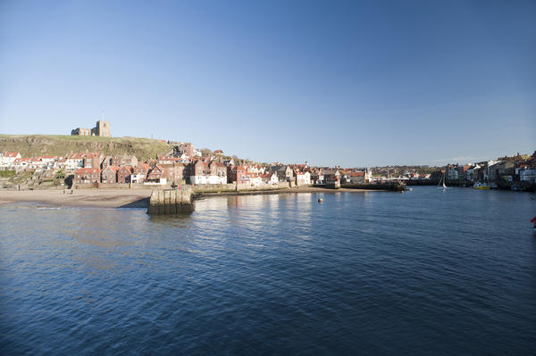 View across the harbour of Tate Hill and St Mary's Church with the town of Whitby stretching up the River Esk