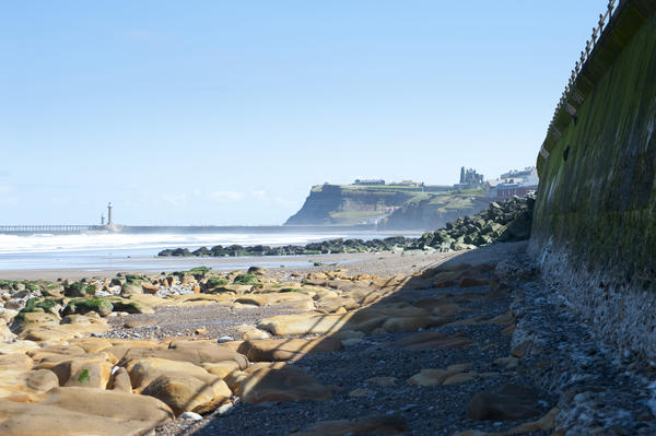 View towards Whitby and Tate Hill looking along the seawall and beach from the west showing the North Yorkshire coastline