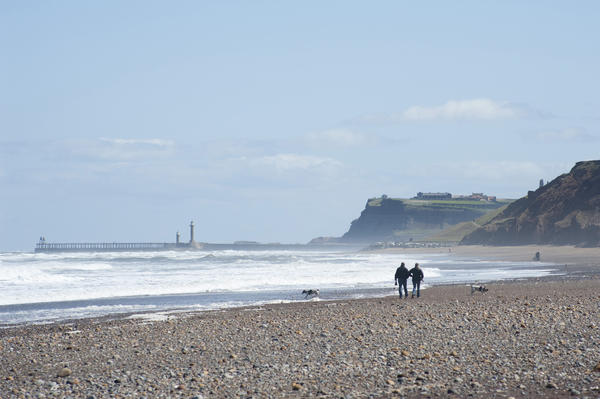 View from the west coast towards Whitby and the harbour entrance with its twin piers with people enjoying a walk along the beach alongside the surf