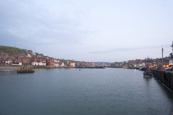 Whitby lower harbour at sunset looking down the River Esk towards the town on either side of the river