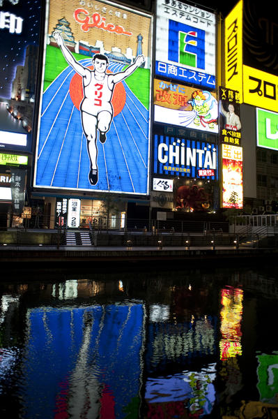 sign, electricity, winner, famous, athlete, illuminated, neon, dotonbori, glico man, reflection, scene, runner, night, japan, osaka, architecture, commercial, buildings, advertising, retail
