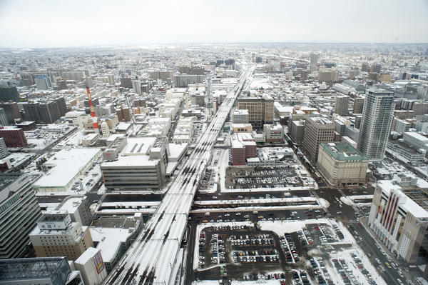 sapporo, aerial, city, view, high angle, japan, winter, snow, urban, season, climate, buildings, streets, cold, railway, weather, cityscape, distance, architecture, infrastructure
