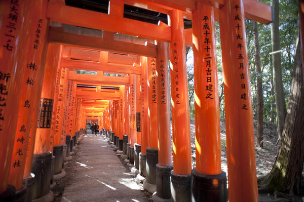 people, light, orange, kanji, figures, pathway, walk, forest, woodland shelter, avenue, red, path, walkways, inari, inari, Fushimi Inari-taisha, kyoto, japan