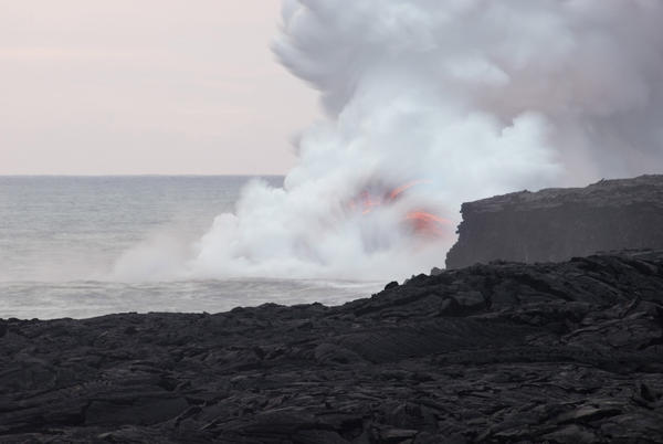 lava meeting the ocean, water, hot, steam, erruption, erupting, volcano, volcanic, hawaii, big island License: