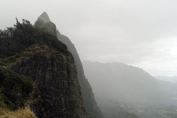 ohau, pali, mountain, lookout, lookdown, vista point, mist, rain, fog, high, peak, pointed, cliffs, steep