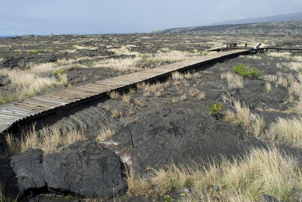 boardwalk leading over lava fields to the pu'u loa petroglyph stone carvings