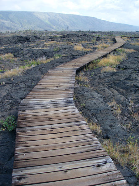a wooden boardwalk protects histroic stone carvings on the volcanic rock at puuloa, hawaii
