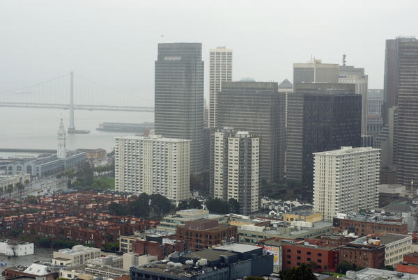 san francisco, fog, rain, mist, bad weather, inclement, california, city, downtown, CBD, business district, skyscrapers, mistly, wet, raining, buildings, tower blocks, offices, tall, skyscraper