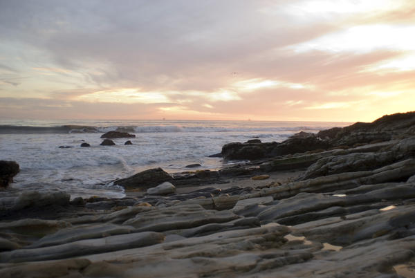 pacific sunset viewed across a rock pavement at Refugio Beach park. california