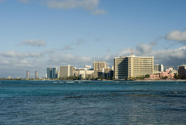 hololulu resort hotels, large, massive, tower, developed, hotels, beachfront, sands, sand, waikiki beach, block, hotel complex, water, bay, waves License: