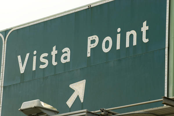 Large overhead American road traffic sign with the words Vista Point and an arrow
