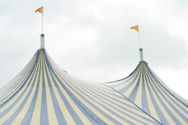big top, canvas, circus, entertainment, marquis, performance, tent, venue, act, traveling, blue white, roof, striped, amusement, flags, yellow License: