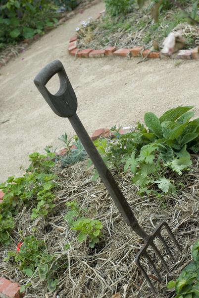 gardening, fork, tool, planting, bed, bedding, path, stone, border, brick, geraniums