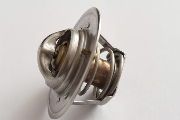 Car thermostat from the side in close-up on white surface, the thermostat uses a bimetalic strip which opens the valve when hot