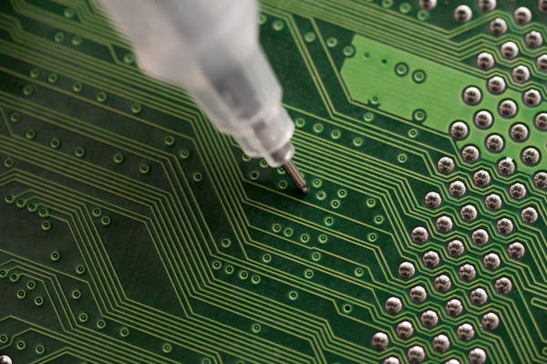 Closeup of a circuit electronical board being fixed