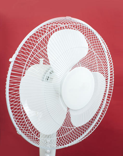 appliance, blades, cooling, domestic, electric, fan, hot, metal, object, pedestal, portable, red background, rotate, spin, white, heatwave, concept, clean, airless