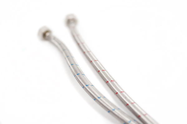 close up, cold, detail, hot, pipes, plumbing, white background, blue, flexible, metal, red, selective focus, opposites, two, pair License:
