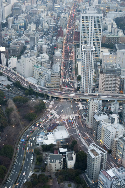 motion blurred traffic looking down on streets of tokyo from the tokyo tv tower