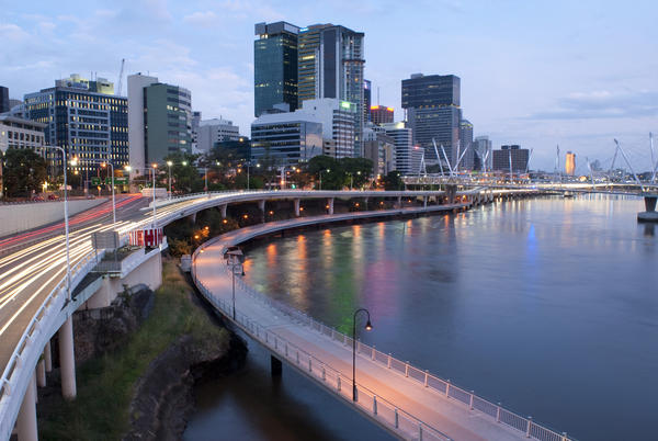 australia, brisbane, queensland, architecture, highway, landmark, lights, pedestrian, reflection, travel, brisbane river, sunset, cbd, kurilpa bridge, waterfront