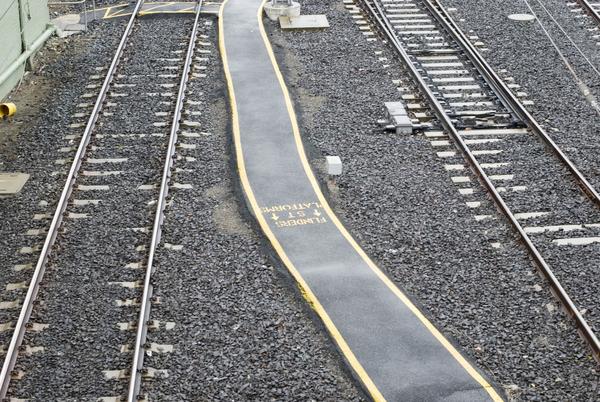 railway, line, tracks, train trackes, rail lines, high angle, view, looking down, iron road, footpath, walkway