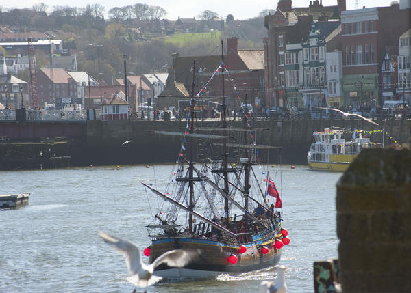 wooden, tourist, ship, coastal, bark, historical, nautical, marine, england, sailing, attraction, flying, replica, seagull, harbour, masts, gull, cruises, endeavour, whitby, north yorkshire, fenders, captain cook, scale model, full size