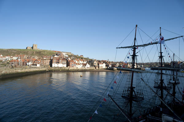 View past the wooden masts of the Endeavour replica across the River Esk to Tate hill and St marys Church, Whitby
