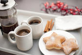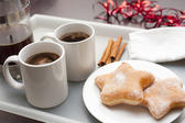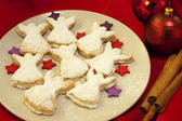 High angle view of cookies or biscuits in the shape of traditional Christmas trees arranged on a baking tray for cooking during Xmas baking