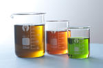 Laboratory beakers filled with multicoloured fluid-9956