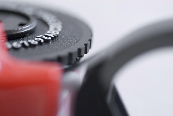 The alphanumerical wheel of a retro Dymo printer with selective focus to the cut symbol