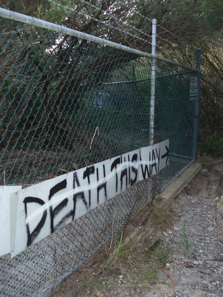 sign written death this way in graffiti scrawl below a chainlink fence