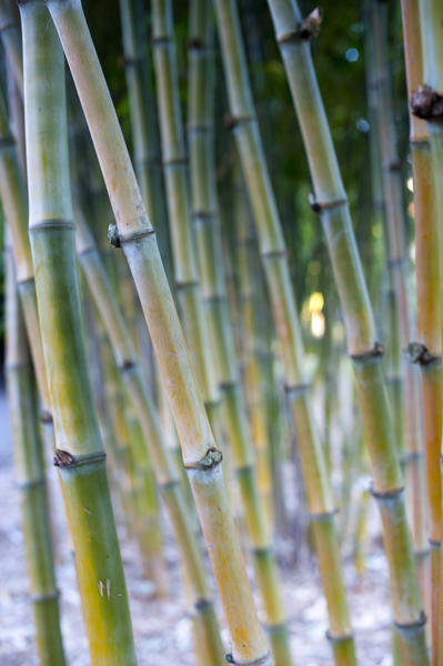 Closeup detail with shallow depth of field of bamboo canes growing in a dense cluster
