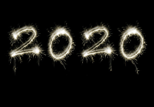 2020 New Year date in fiery sparklers over a black background with copy space for a holiday greeting