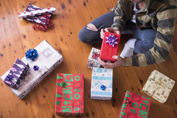 Person holding a festive red Christmas gift in his hand as he kneels on a wooden floor surrounded by holiday presents