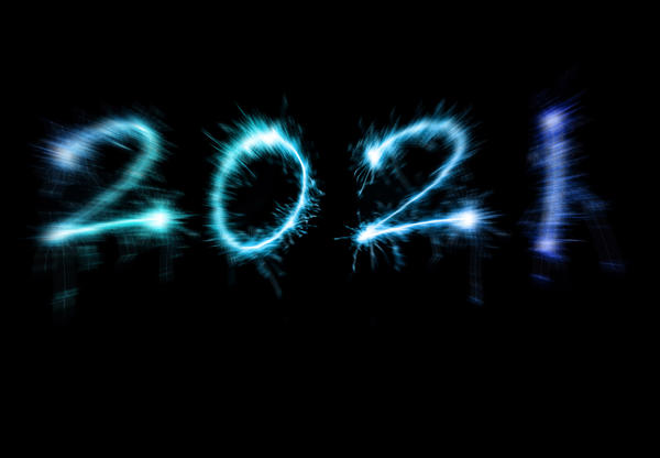 Sparkling blue year 2021 digits with blurred edges, glowing in the dark isolated on black background with copy space