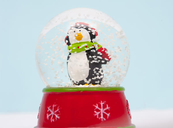 christmas, festive, seasonal, xmas, bird, ornament, penguin, shaken, snow globe, snowflakes, swirling, winter, glass, sphere, water, celebration, holiday, decoration, orb, scarf