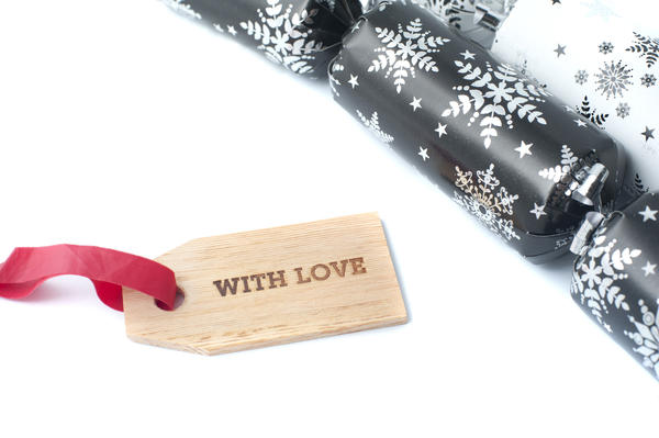 Wood textured gift tag saying With Love tied with a red ribbon lying on a white background alongside a decorative Christmas cracker with snowflakes