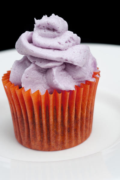 Closeup of a single freshly baked party cupcake with decorative purple icing