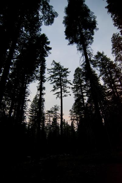 pastel dusk colors through silhouetted trees in the yosemite national park