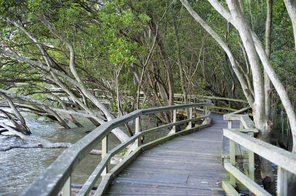 Empty raised wooden riverside broadwalk winding amongst the trees allowing one to walk through nature