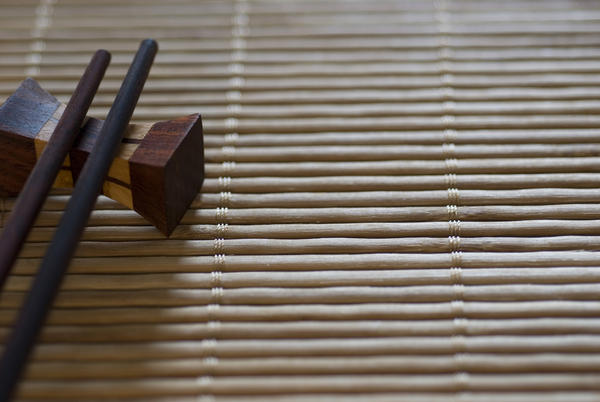 A pair of Asian chopsticks lying on a wooden rest on an empty bamboo place mat ready for your placement of food.