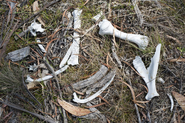 Bleached white animals bones lying scattered on the ground in a stark reminder of death and mortality