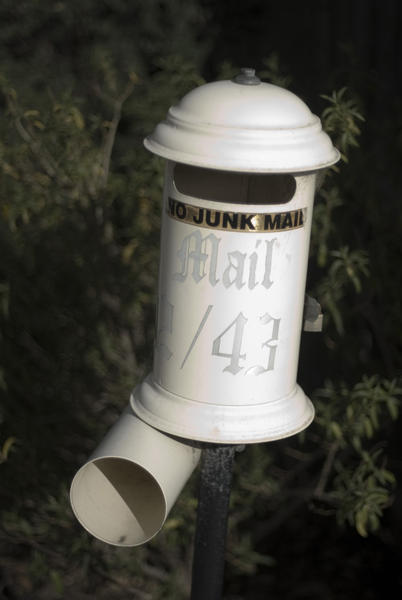 Cylindrical white letterbox with the words No Junk Mail on a dark foliage background