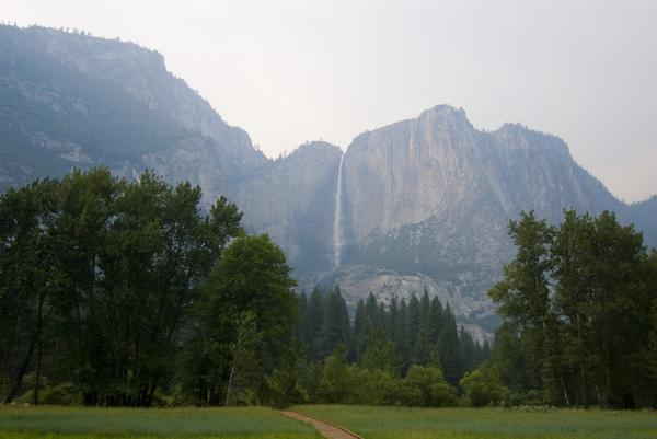 the view of a spectacular waterfalls from a meadow in the yosemite valley