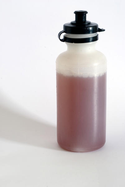 Reusable translucent plastic sports drink bottle filled with a refreshing energising brown liquid